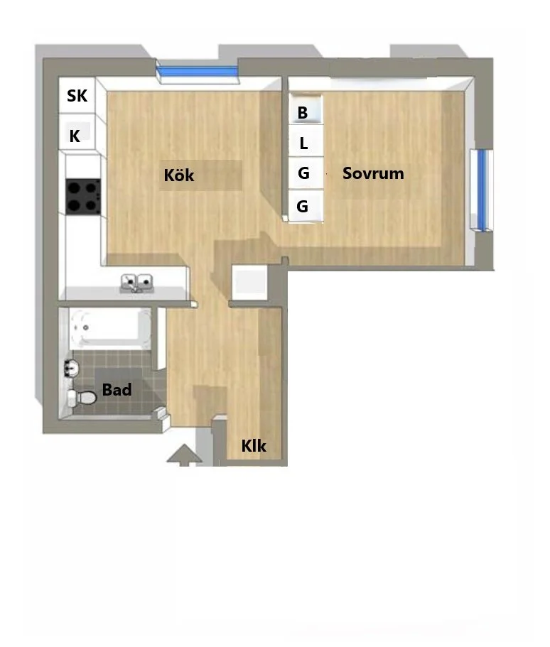 En 1:a på 26 kvm en trappa ner. Lägenheten färdigställdes våren 2021 och då med nya ytskikt i hela lägenheten. Entrén leder dig in i en hall med plats för avhängning till vänster och kök till höger. Till vänster finns även en rymlig toalett med helkaklade väggar och klinkergolv. Badrummet är utrustat med dusch, spegelskåp med ledbelysning och handukstork.