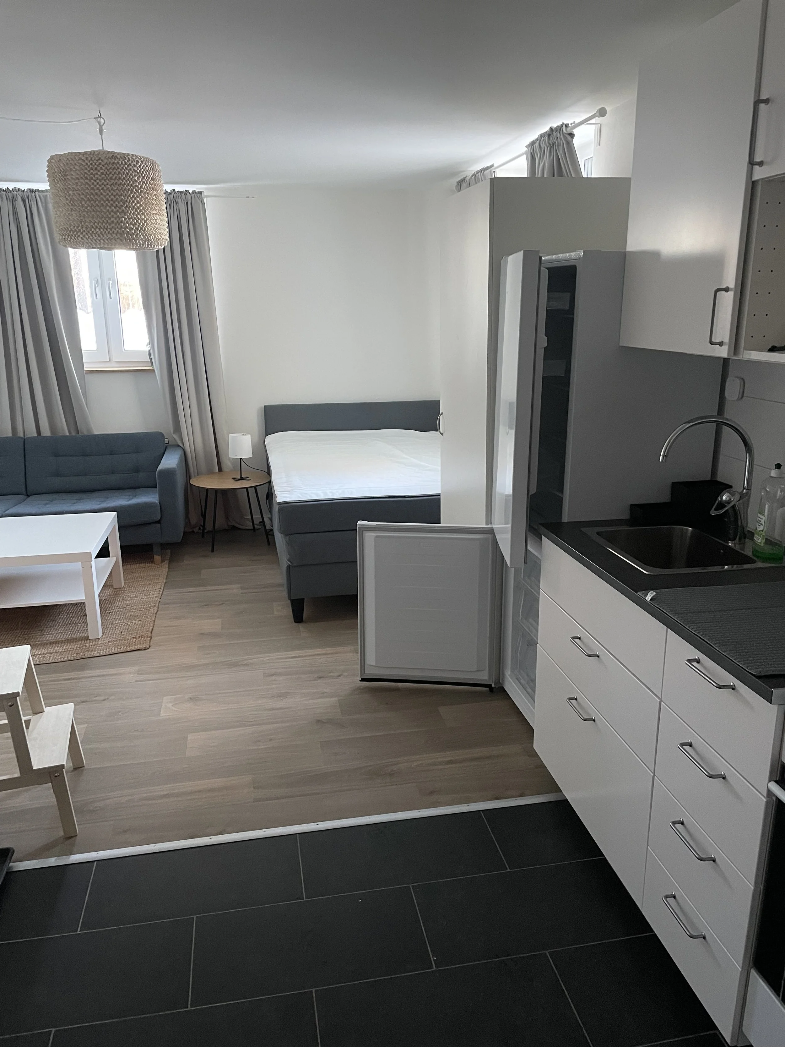 Rakt fram breder rummet ut sig med köksytan till höger och rummet med med plats för vardagsrumsmöbler, säng och litet matbord. Köket består av IKEA skåp med fullstor spis med glaskeramikhäll och varmlufts ugn, en rejäl diskbänk, inbyggd mikro samt kyl och frys (ej frysfack). Hel lägenheten har vattenburen golvvärme för uppvärmning. Hallen samt badrummet har ett klinkergolv, övrig yta har en trivsam vinyl matta.